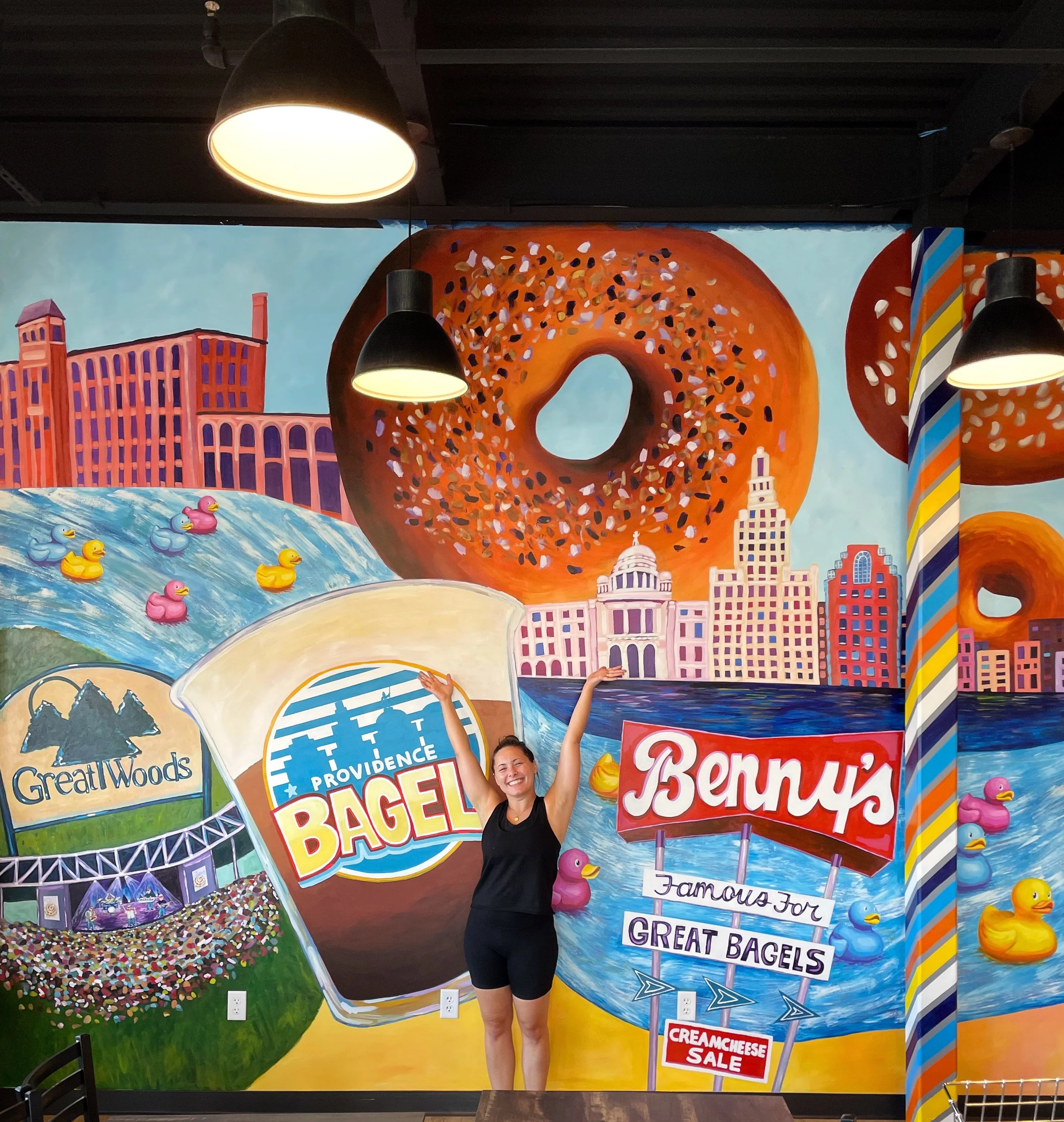 I created a mural for Providence Bagel’s URI location that blended the Providence skyline with Narragansett icons.